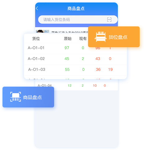 - 货位盘点:按货位查询货位上的商品进行盘点